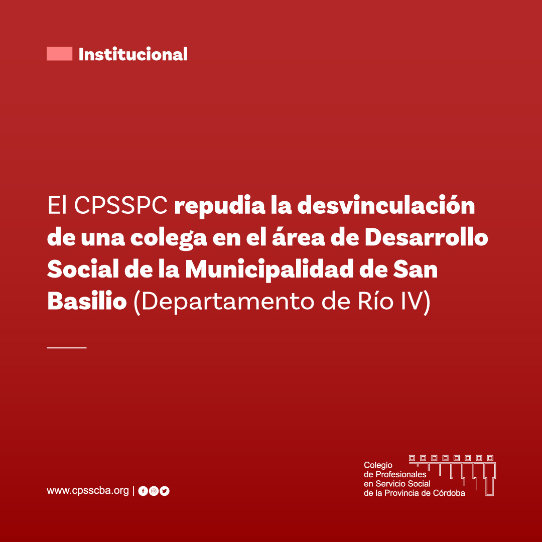 El CPSSPC repudia la desvinculación y se pronuncia en contra de la RUPTURA al PRINCIPIO DE ESTABILIDAD DEL EMPLEO PÚBLICO (CN 14 BIS y CP art. 23) de la Lic. en Trabajo Social Maria Liria Ladousse MP: 1530 quien desempeñaba funciones en el área de Desarrollo Social de la Municipalidad de San Basilio (Departamento de Río IV). La colega se encuentra debidamente matriculada y sin sanciones éticas en su ejercicio profesional.