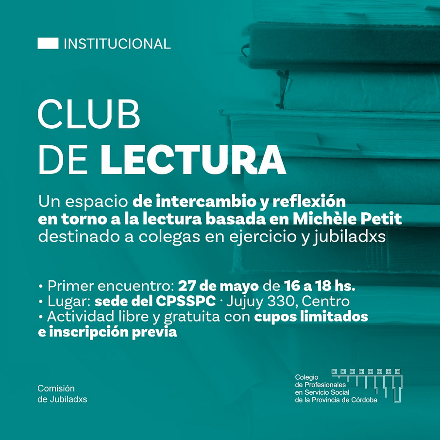 La Comisión de Jubiladxs del Colegio Profesional de Servicio Social de la Provincia de Córdoba (CPSSPC) lanza el “Club de lectura”, una iniciativa que busca generar un ámbito de encuentro, diálogo y reflexión a través de los libros.