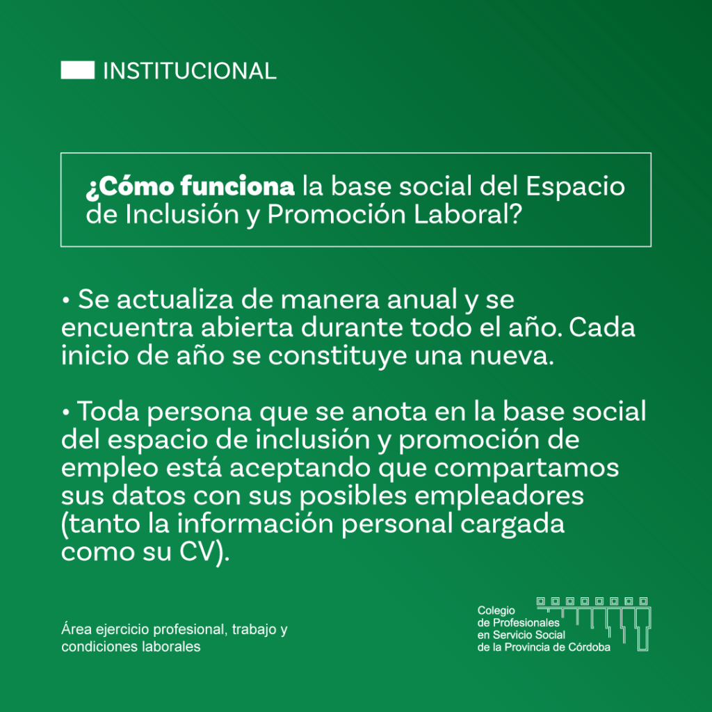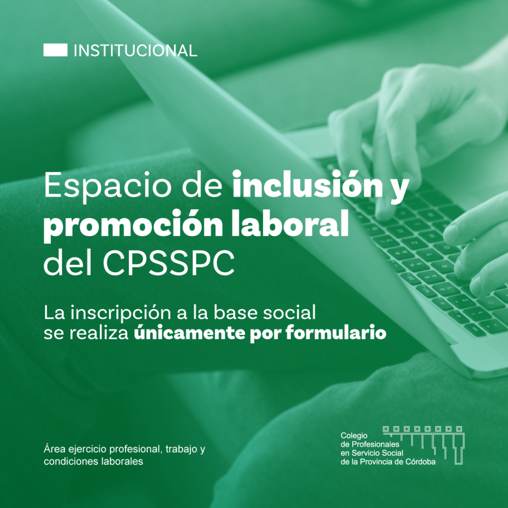 El Colegio de Profesionales en Servicio Social de la Provincia de Córdoba (CPSSPC) informa que ya se encuentra habilitado el formulario para la inscripción a la base social 2025 de su Espacio de Inclusión y Promoción Laboral, una herramienta clave para conectar a profesionales matriculados con posibles oportunidades de empleo.