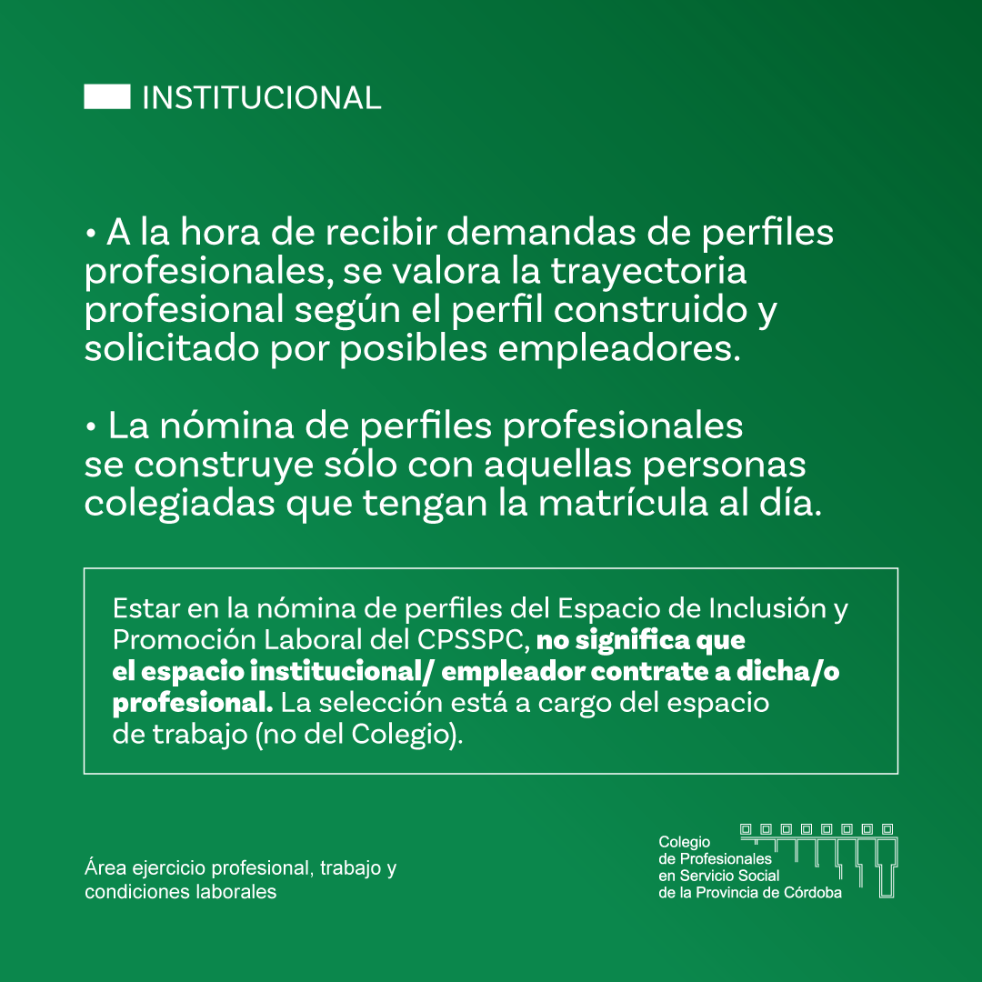 Asimismo, el Colegio aclara que la nómina de perfiles profesionales se construye únicamente con aquellas personas colegiadas que tengan su matrícula al día. Si bien ser parte de esta nómina permite la visibilización de los profesionales ante potenciales empleadores, el CPSSPC enfatiza que la decisión final de contratación es responsabilidad exclusiva del espacio de trabajo o empleador, y no del Colegio.