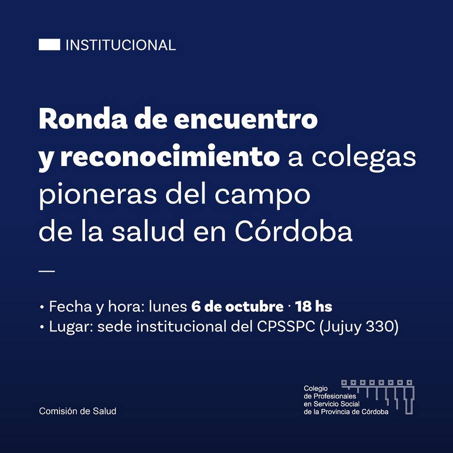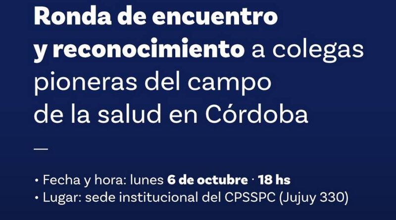 Desde la Comisión de Salud del CPSSPC invitamos a la “Ronda de encuentro y reconocimiento a colegas pioneras del campo de la salud en Córdoba”.