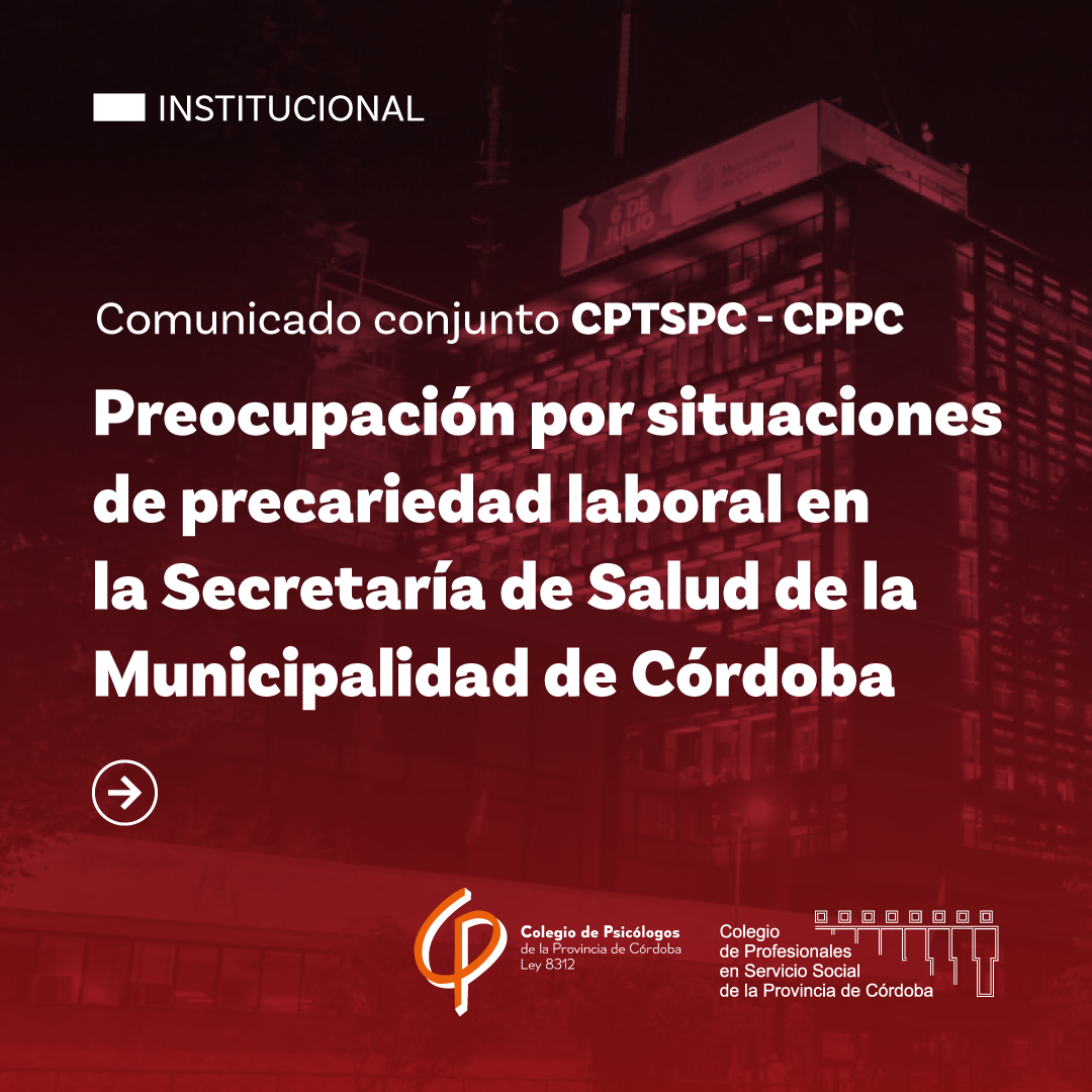 El Colegio de Profesionales en Trabajo Social de la Provincia de Córdoba (CPTSPC) y el Colegio de Psicólogos de la Provincia de Córdoba (CPPC) manifiestan su preocupación ante la persistencia de situaciones de PRECARIEDAD LABORAL DE PROFESIONALES TRABAJADORAS/ES SOCIALES Y PSICÓLOGAS/OS que se desempeñan en la Secretaría de Salud de la Municipalidad de Córdoba.