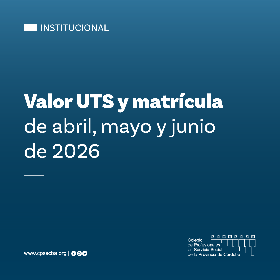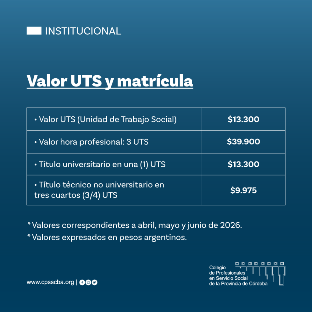 Información Institucional Nuevos Valores de UTS y Matrícula que entra en vigencia en abril de 2026 cpsspc 1 de abril de 20268 de abril de 2026 0 comentarios A partir del mes de abril de 2026 regirá el nuevo valor de UTS y Matrícula, según lo aprobado por la Asamblea Anual Ordinaria 2023. Dicha Asamblea estipula una actualización trimestral de acuerdo al valor de la Canasta Básica Alimentaria