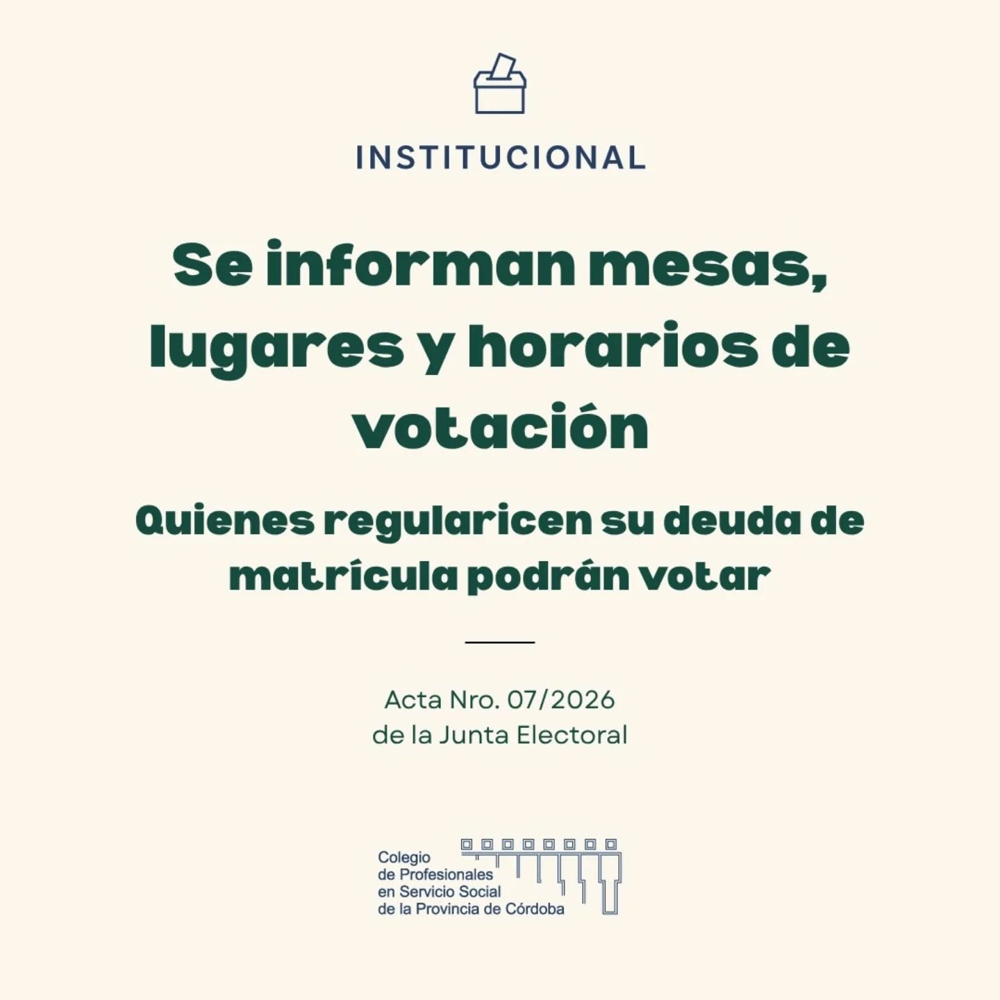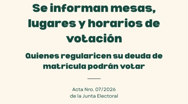 A través del Acta N° 07/2026 y su correspondiente Anexo, el organismo electoral confirmó los lugares y horarios de sufragio para las 15 mesas habilitadas. Asimismo, se estableció un procedimiento excepcional para garantizar el derecho al voto de profesionales que regularicen su situación administrativa.