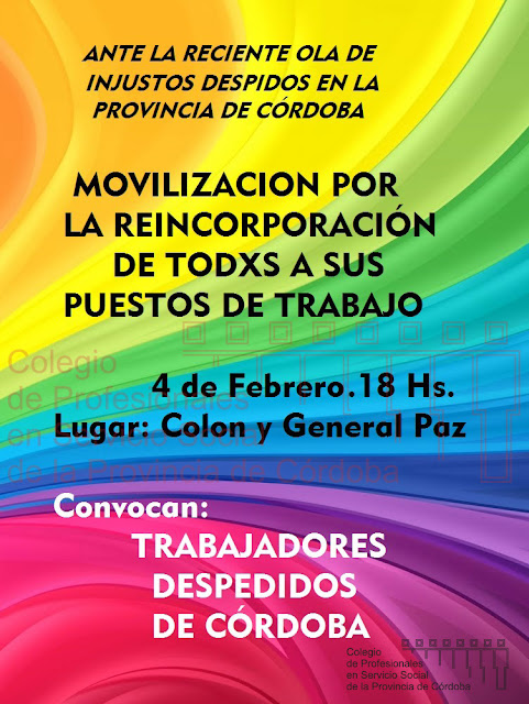 Ante esta situación de emergencia, lxs trabajadorxs despedidxs de las tres reparticiones señaladas invitamos y convocamos a todas las organizaciones sociales, civiles y políticas y a la ciudadanía en general, por la defensa de nuestros puestos de trabajo, la defensa de los derechos humanos, y la continuidad de estas políticas públicas, a marchar el jueves 4 de febrero, a las 18 hs. desde Colón y General Paz.