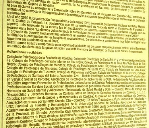 Información Institucional Solicitada en defensa de la ley nacional de salud mental cpsspc 20 de noviembre de 201721 de noviembre de 2017 0 comentarios Esta solicitada fue firmada por distintas organizaciones de profesionales, sindicales, de DDHH y sociales de la Argentina. Nuestra Federación (FAAPSS) y la FEPUC también la suscriben.
